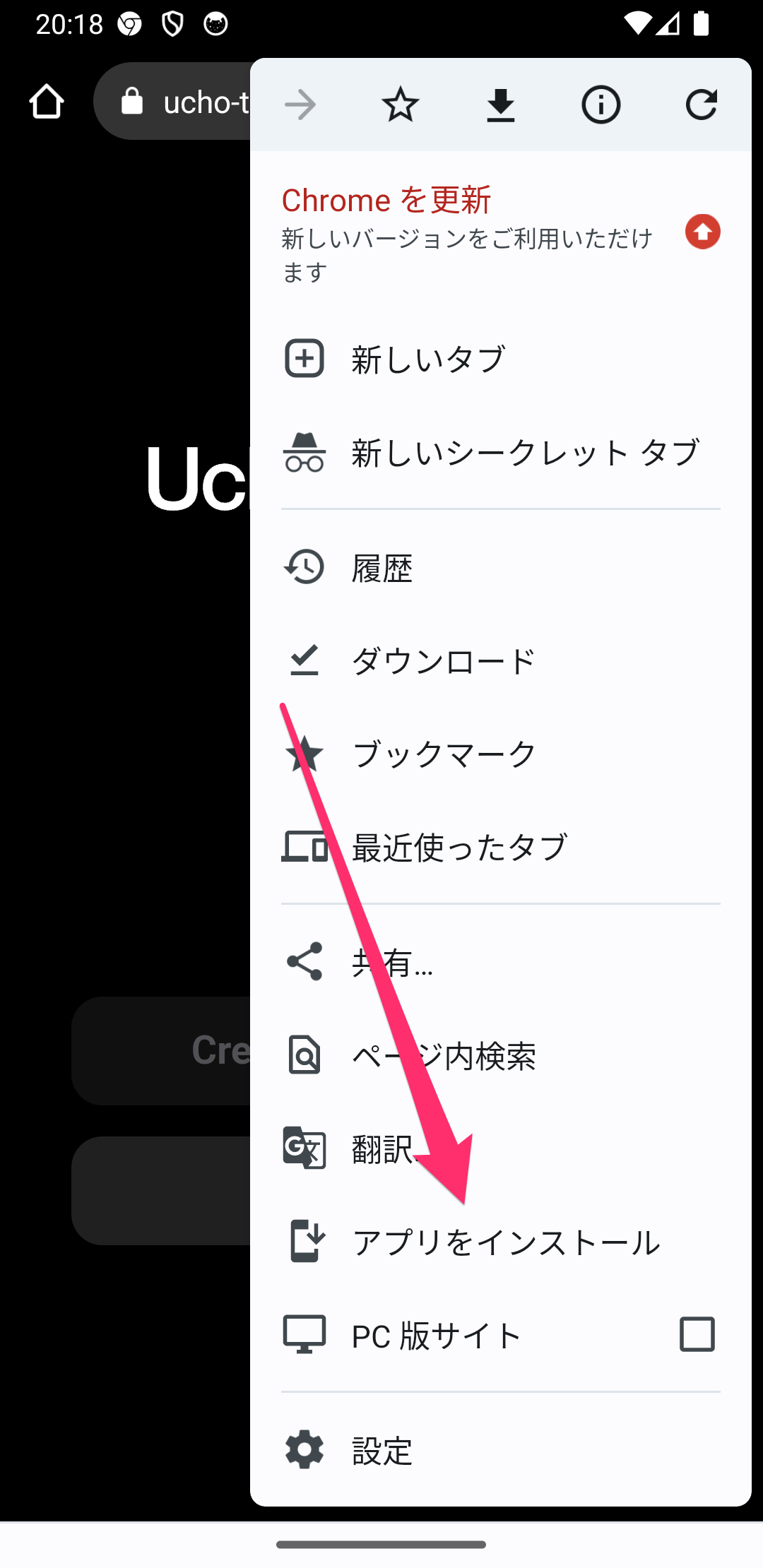 | 1. ChromeでUcho-tenにアクセスし 「メニュー」をタップ |