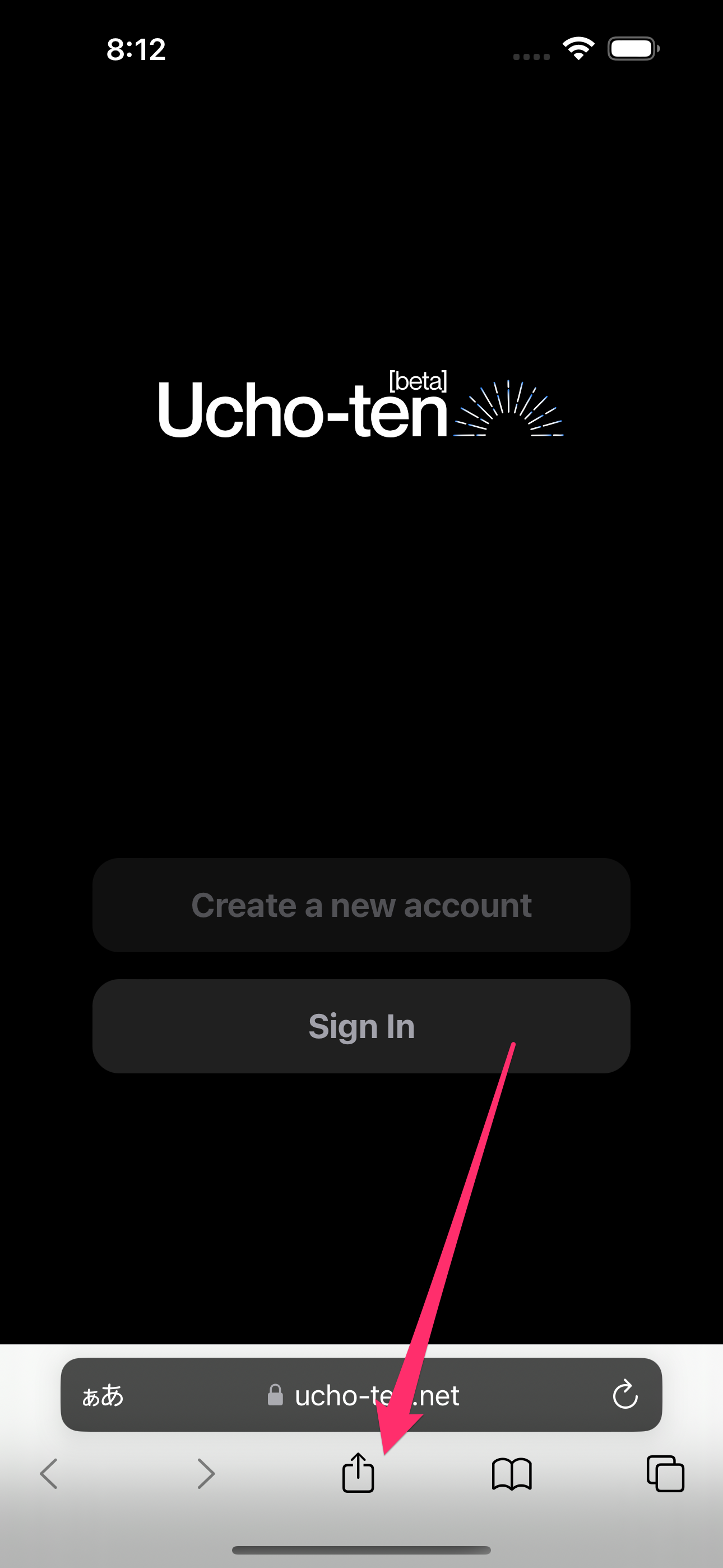 | 1. SafariでUcho-tenにアクセスし 「共有」ボタンをタップ |